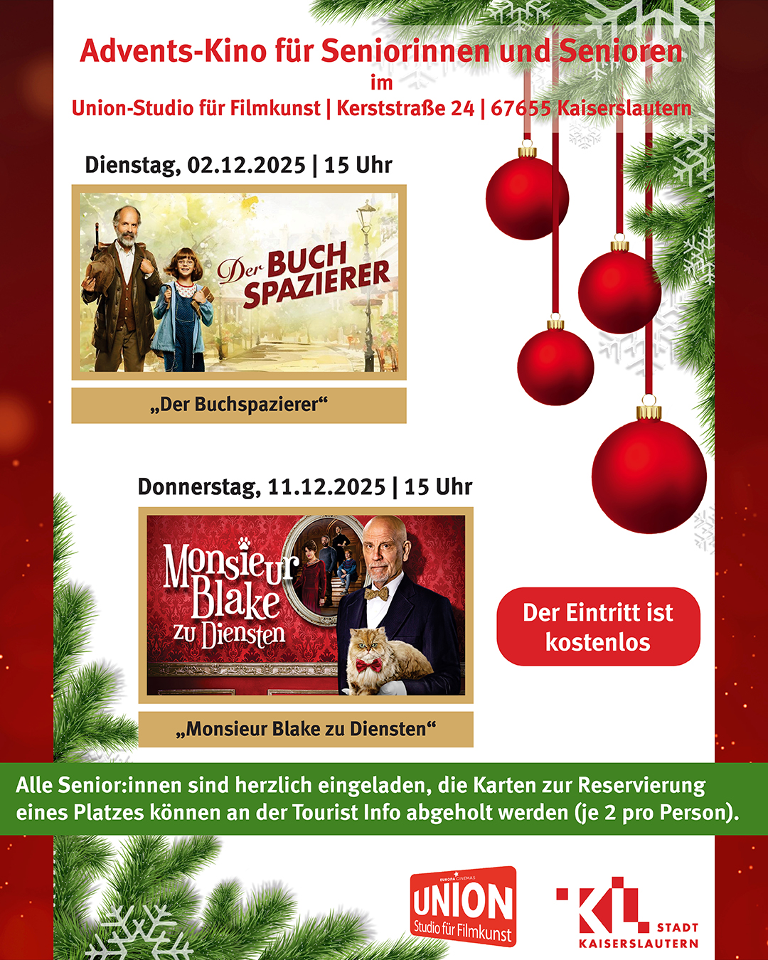 Weiterhin sind noch kostenlose Karten für das Weihnachtskino für Senioren am Donnerstag, 11. Dezember 2025, erhältlich. Die Filmvorführung „Monsieur Blake zu Diensten“ beginnt um 15 Uhr im Union Studio für Filmkunst. Kostenlose Eintrittskarten können in der Tourist Information abgeholt werden. Die Öffnungszeiten der Tourist Information sind dienstags bis freitags von 9 bis 17 Uhr und samstags von 10 bis 14 Uhr.